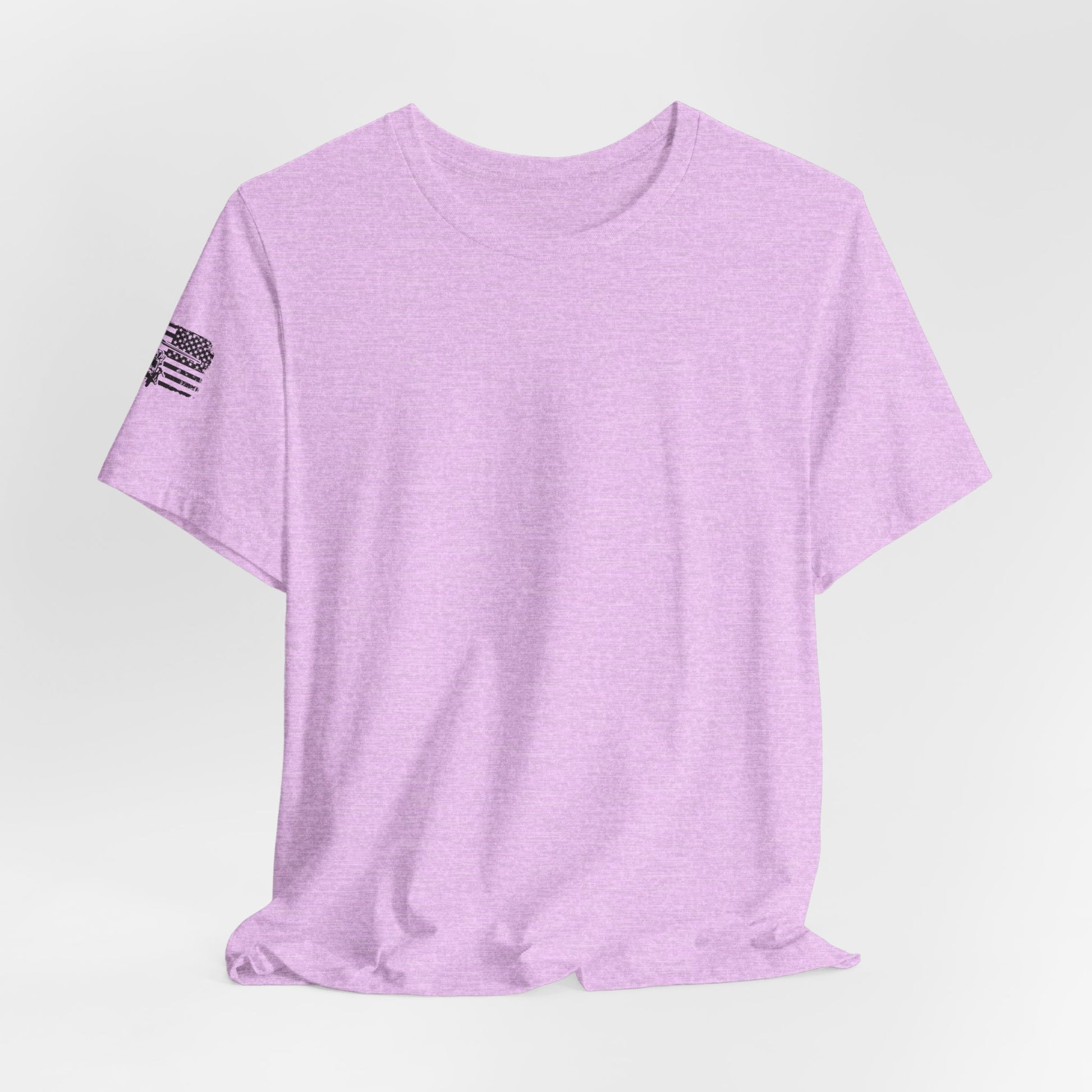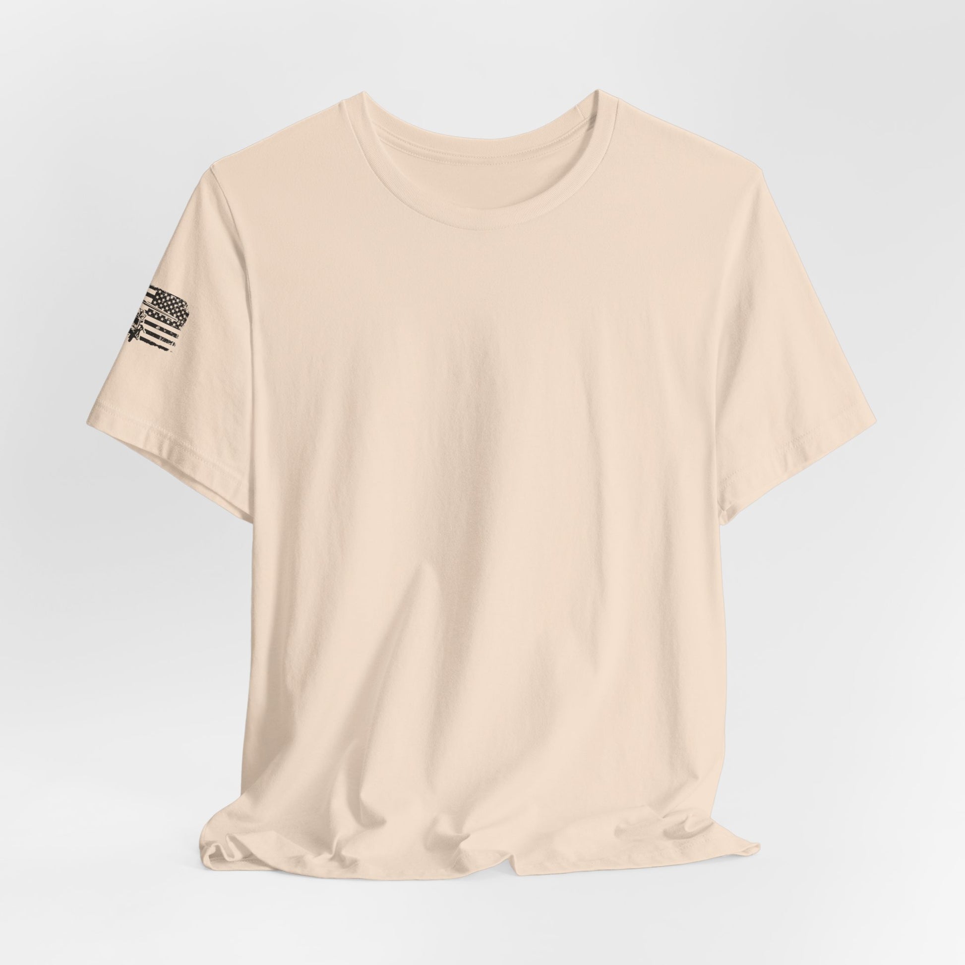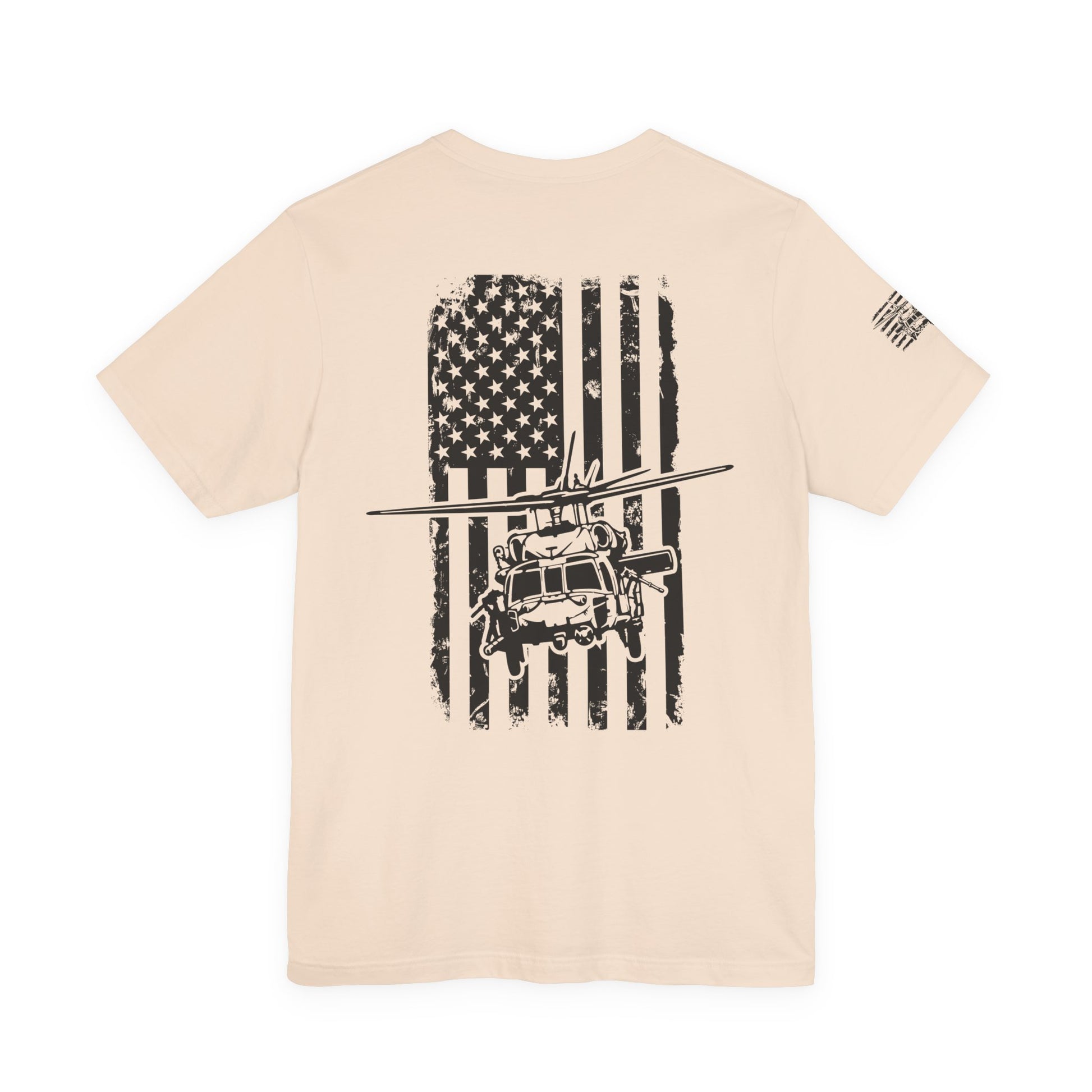 Lightweight, breathable, and built for movement — this crew-neck tee pairs a clean retail fit with a bold, graphic back that quietly speaks to service, flight, and grit. The faded American flag backdrop and detailed aircraft illustration sit centered on the back, while a small emblem on the sleeve offers a low-key nod to identity. Wear it on humid training days, weekend flights to the strip, or while swapping stories at the hangar. The soft Airlume combed cotton feels broken-in from the first wear and layers easily under a jacket when the wind picks up.