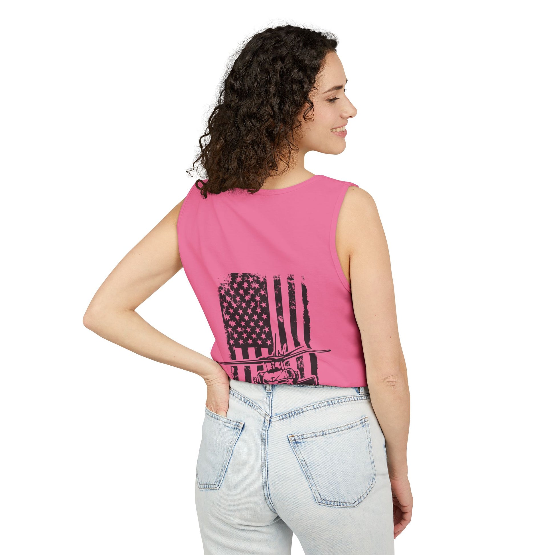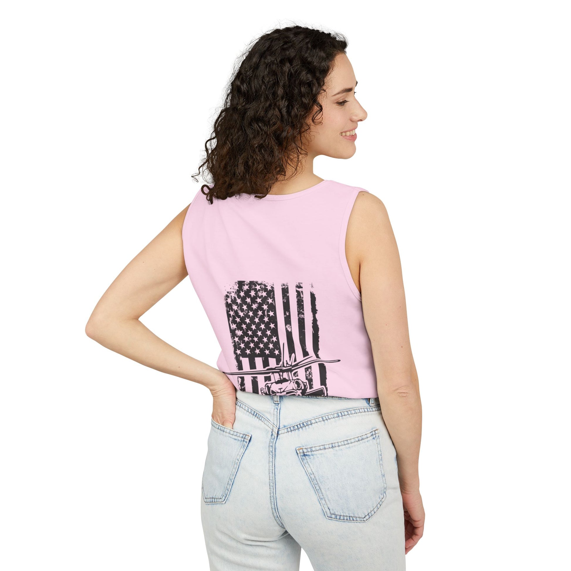 This garment-dyed tank brings a lived-in softness and quiet confidence to summer rotations. The relaxed silhouette and smooth ringspun cotton sit light against skin, while the faded, back-centered graphic — a distressed American flag with a detailed helicopter silhouette — gives it a rugged, quietly patriotic edge. Wear it after a long training session, layered under an open shirt for an evening bonfire, or on weekend drives where comfort and a bit of grit matter. The tubular knit and self-fabric binding keep lines clean and simple; the sewn-in twill label adds a subtle, finished touch. It feels broken-in from day one, like a favorite piece you reach for when you want to move freely and say something without shouting.